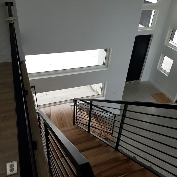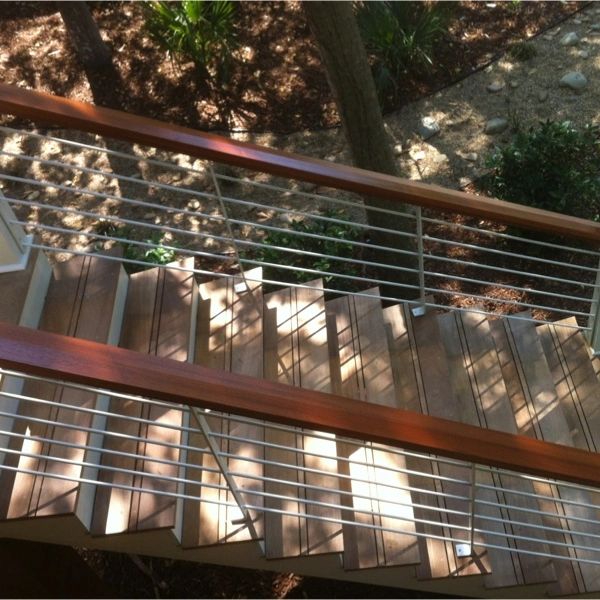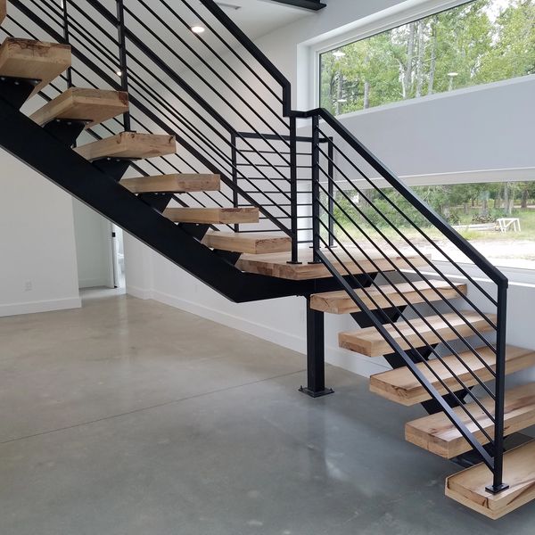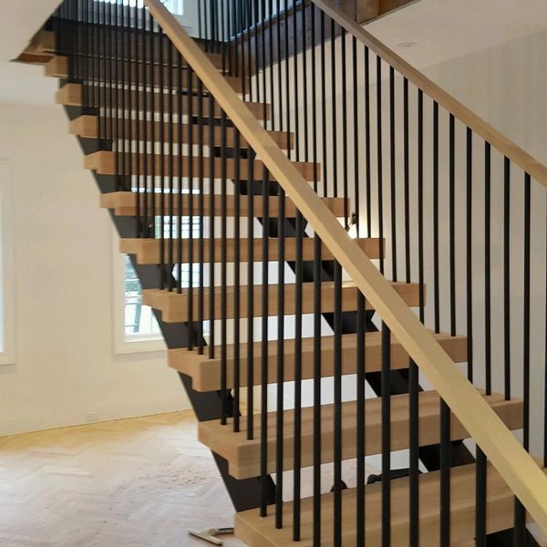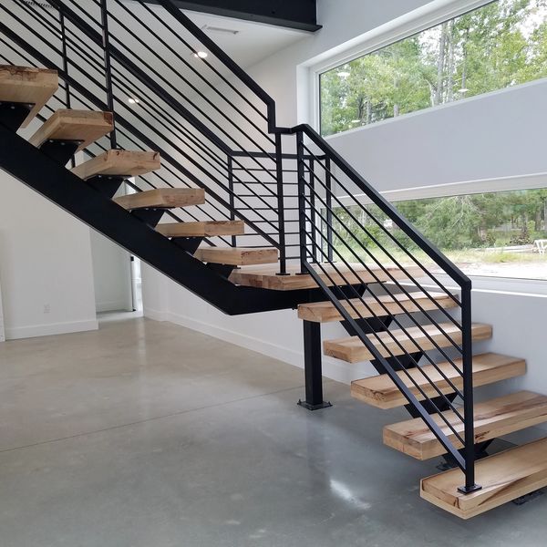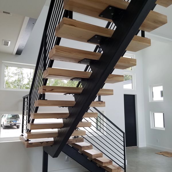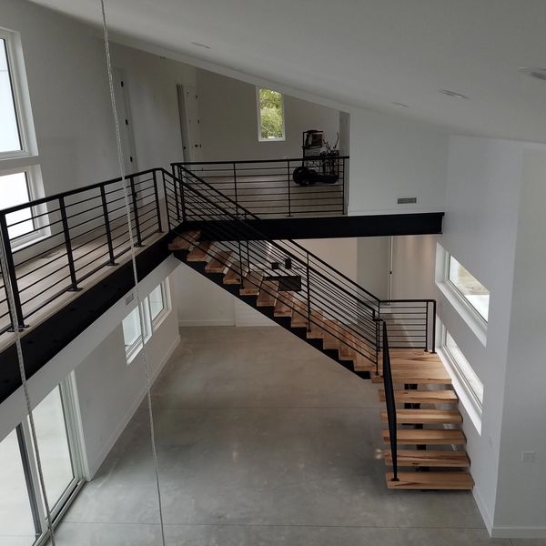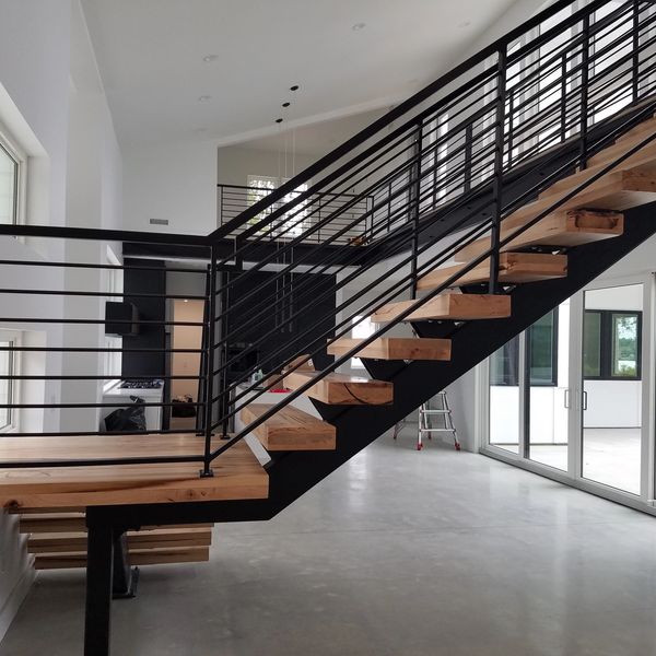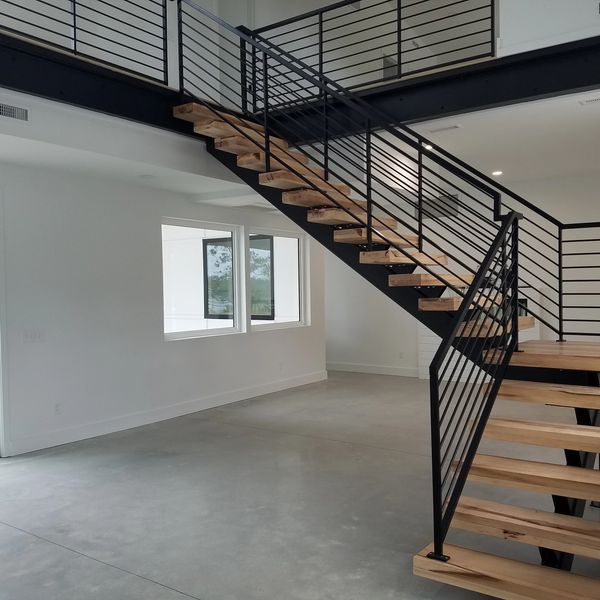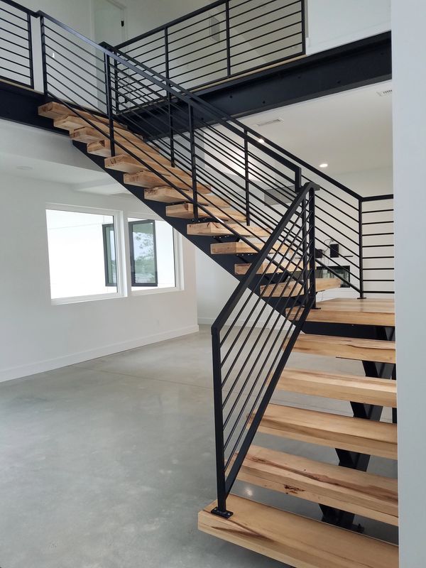 Monobeam stair with vertical rail pickets and custom wood rail cap