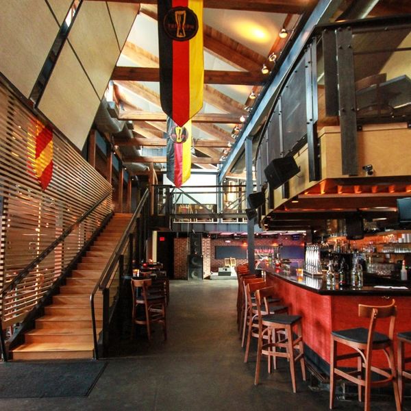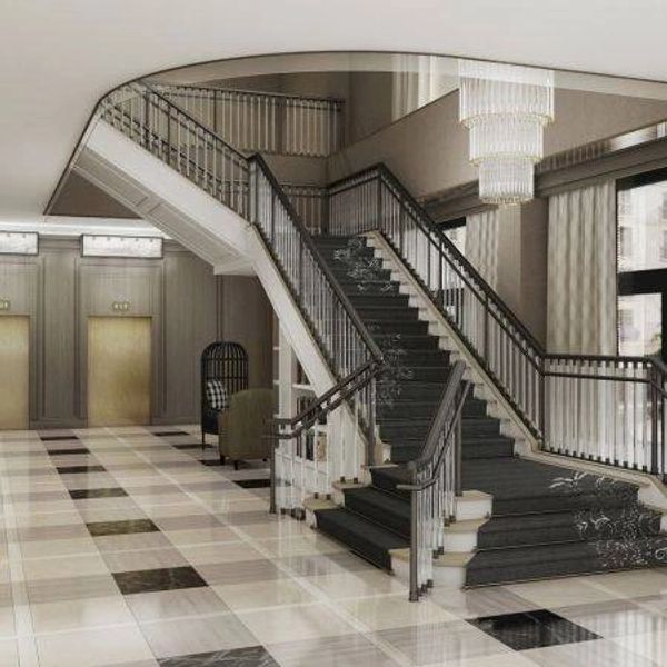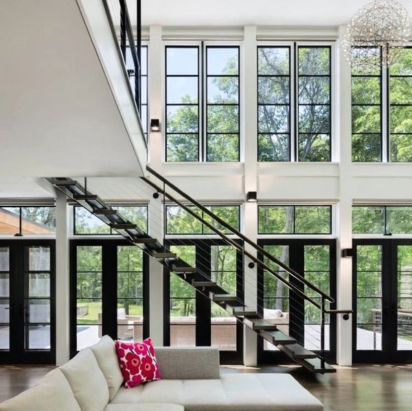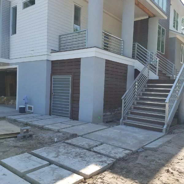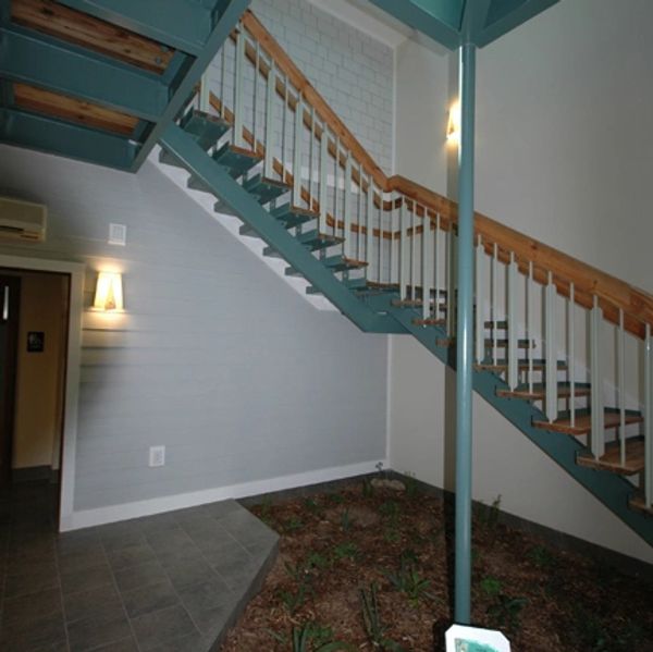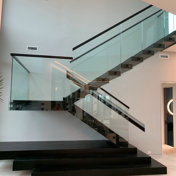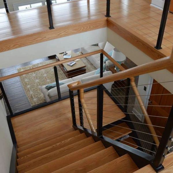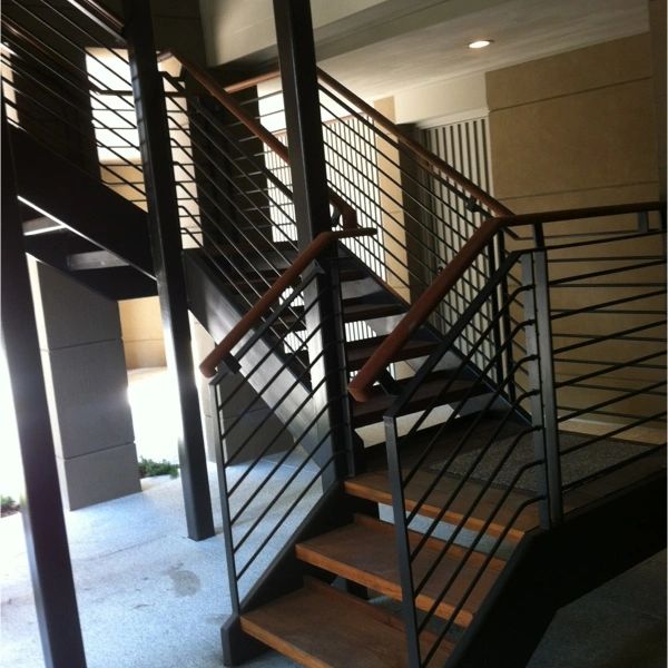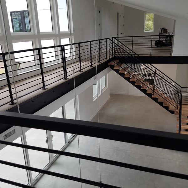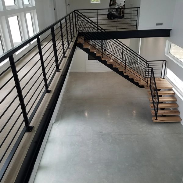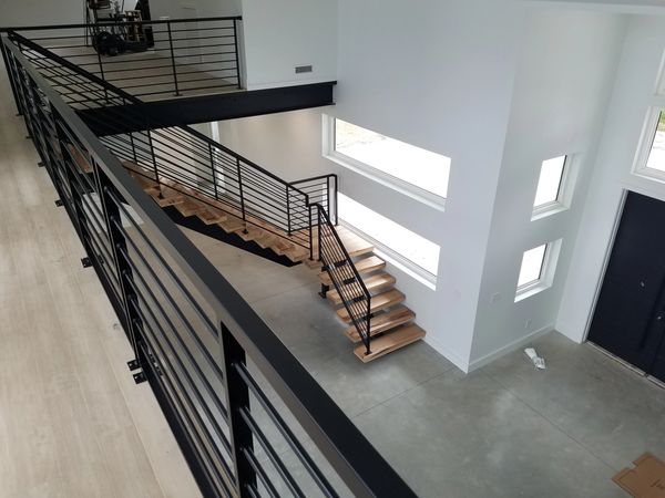 Monobeam stair with vertical rail pickets and custom wood rail cap